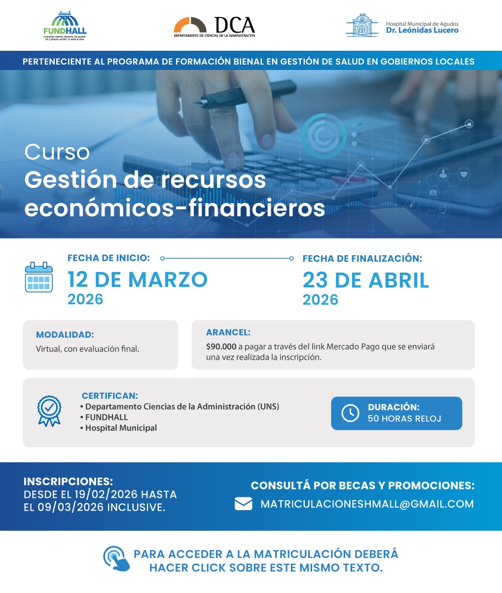 Informamos que a partir de hoy se abrirá la inscripción al curso "Gestión de recursos económico-financieros" que pertenece al "Programa de Formación Bianual en Gestión de Salud en Gobiernos Locales" declarado de interés municipal por el Municipio de Bahía Blanca.