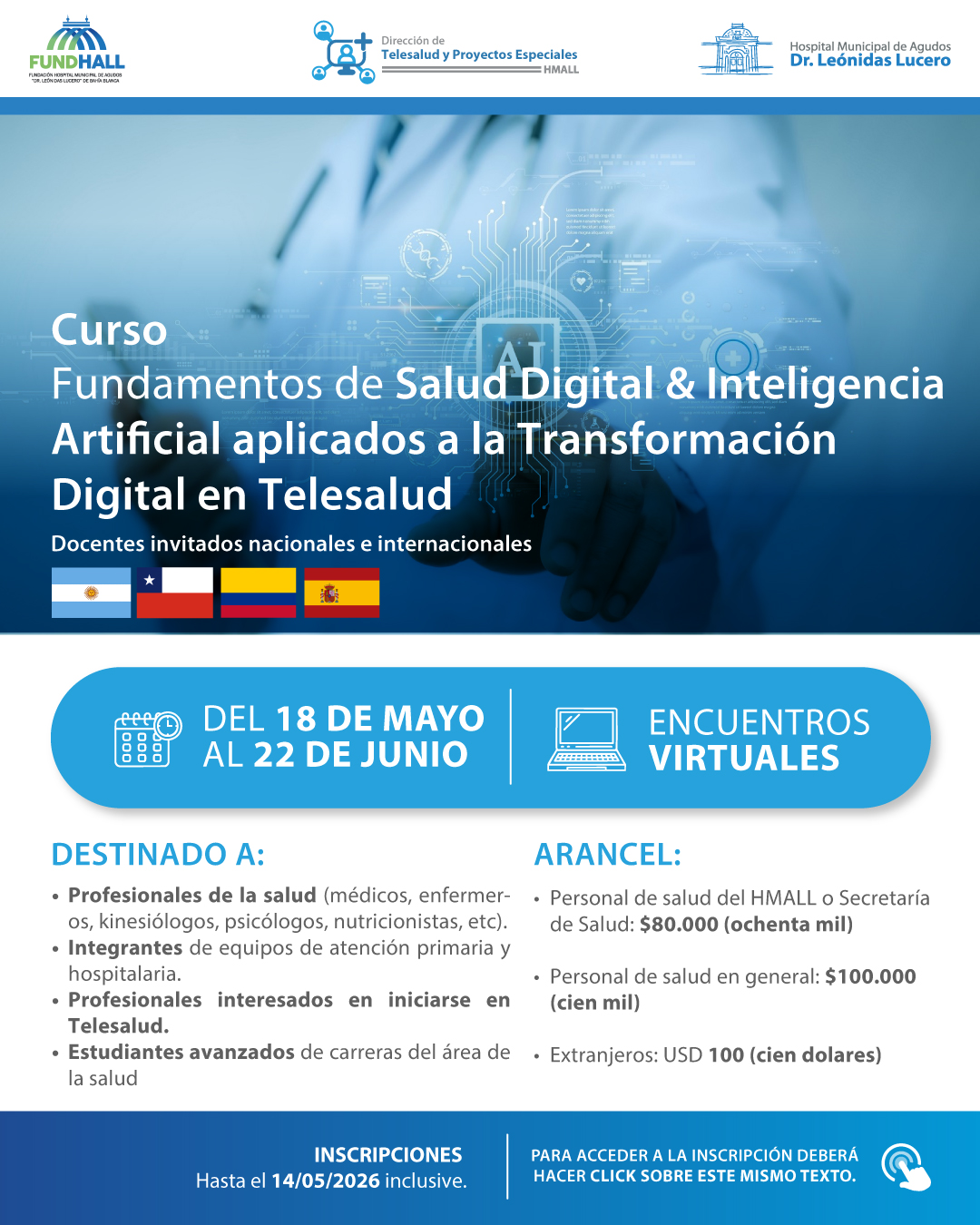 Informamos que se encuentra abierta la inscripción al curso "Fundamentos de Salud Digital & Inteligencia Artificial aplicados a la Transformación Digital en Telesalud", organizado por la Dirección de Telesalud y proyectos Especiales y FUNDHALL del Hospital Municipal de Agudos "Dr. Leónidas Lucero".