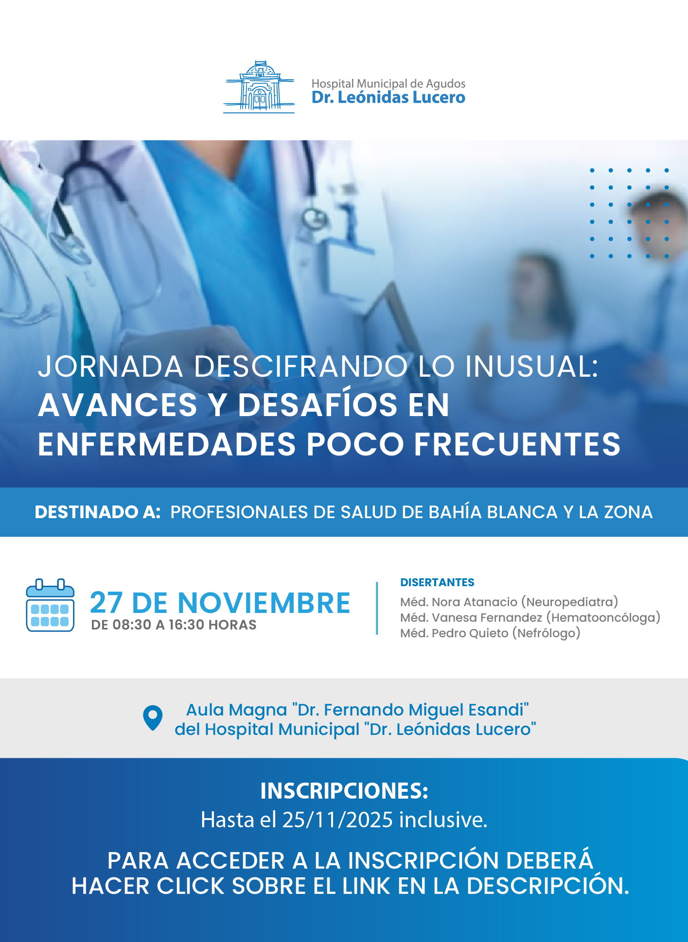 Informamos que se encuentra abierta la inscripción a la "Jornada Descifrando lo Inusual: Avances y Desafíos en Enfermedades Poco Frecuentes", organizado por la Unidad de Hospital de Día Pediátrico del Hospital Municipal de Agudos "Dr. Leónidas Lucero".